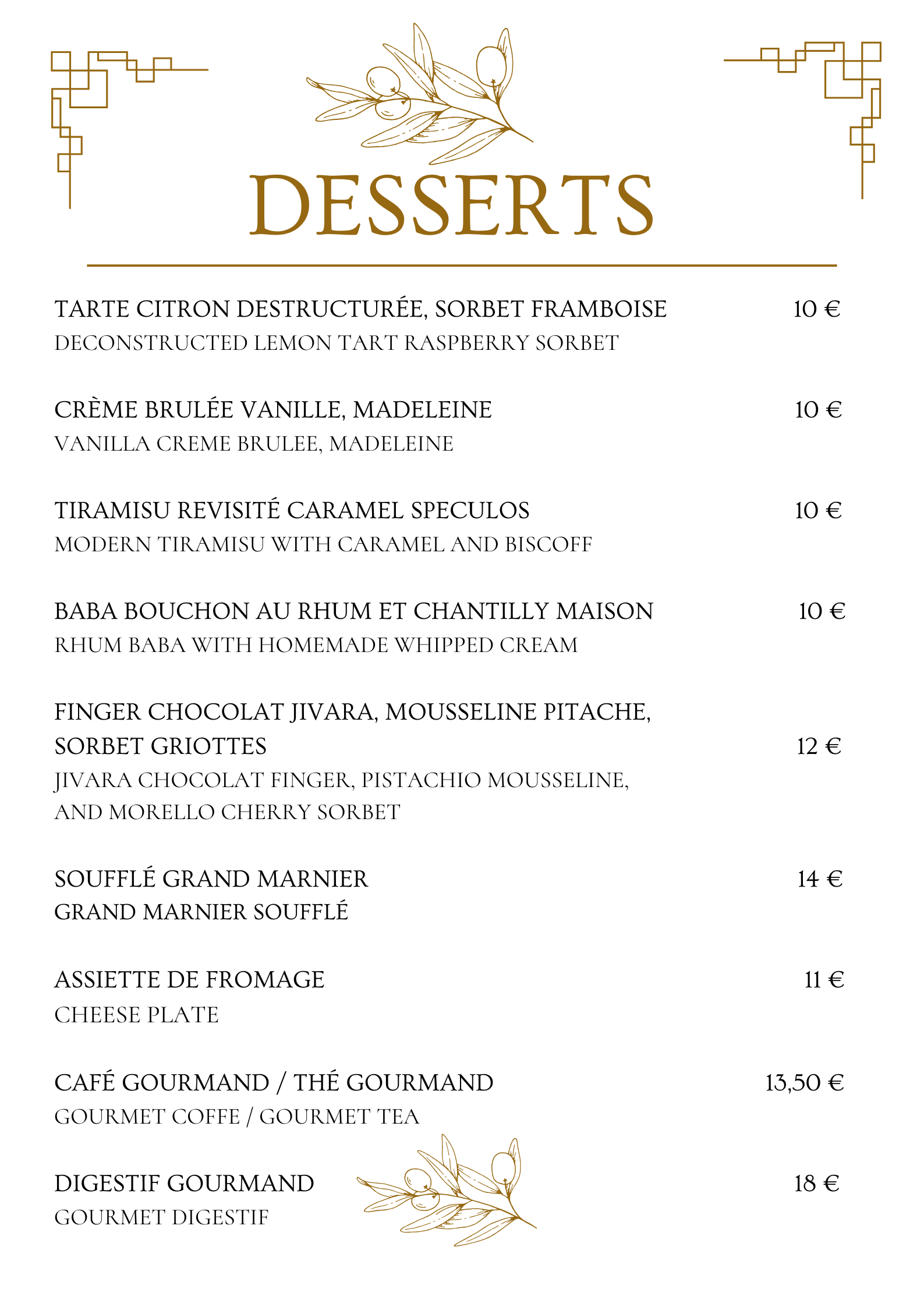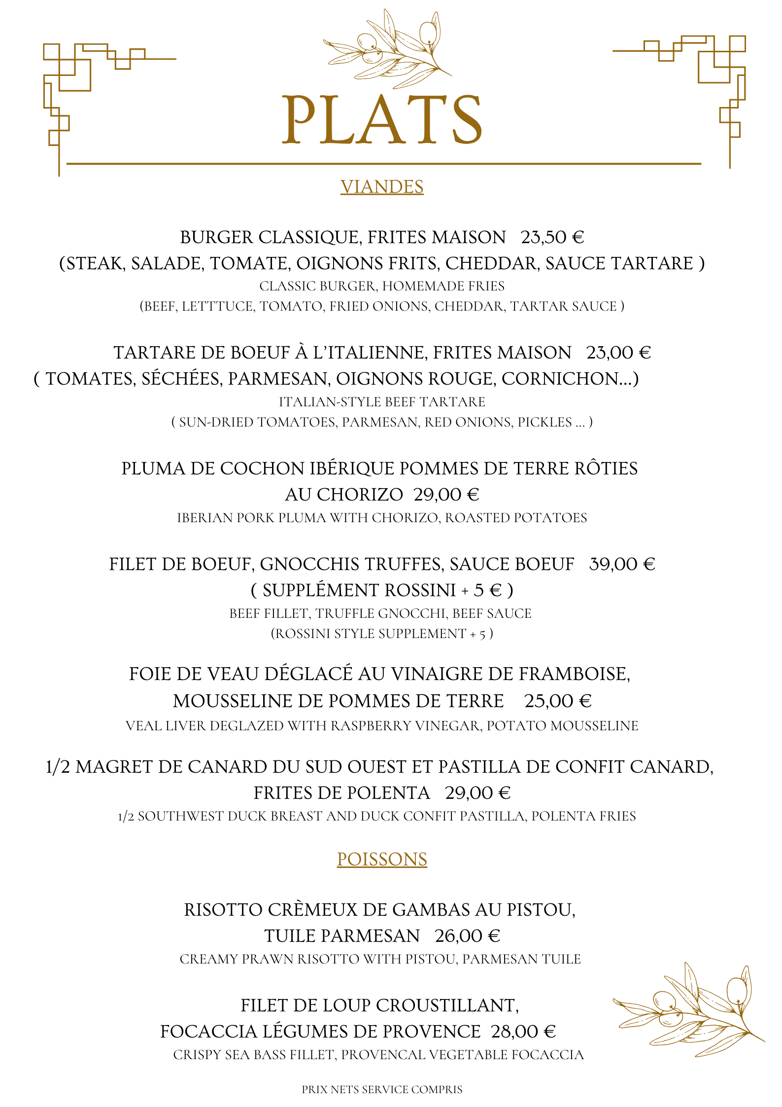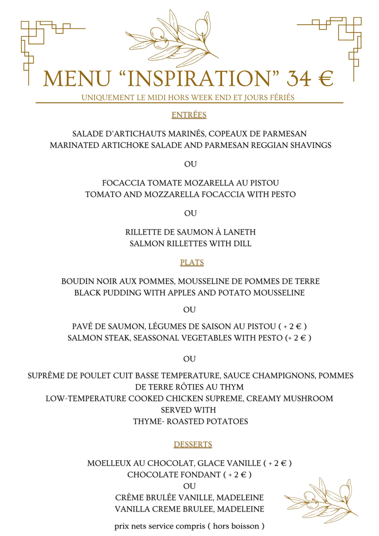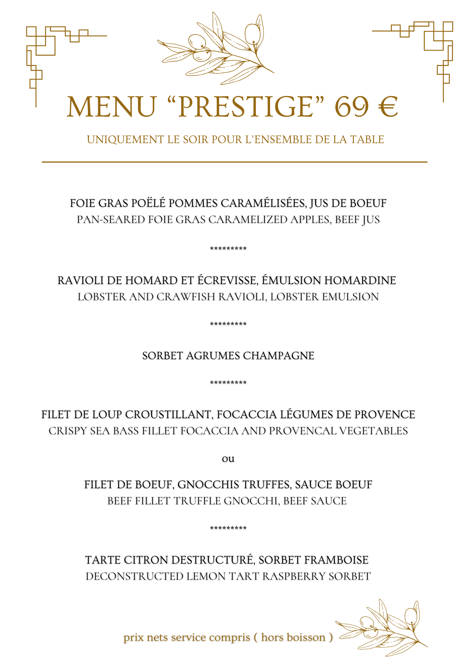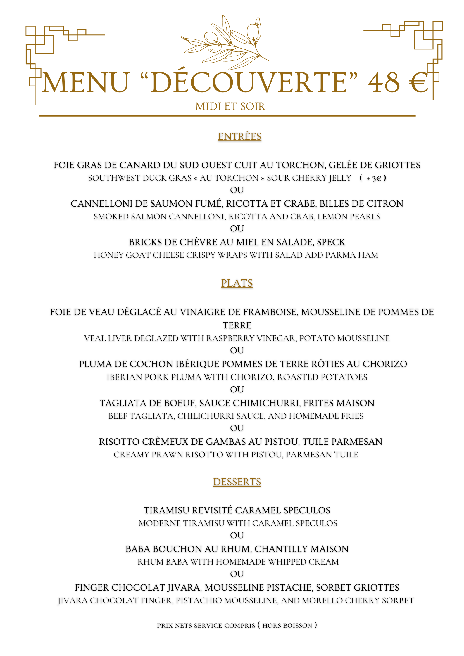 • Nos spécialités : Ne manquez pas notre foie gras de canard cuit au torchon ou nos desserts, souvent salués par nos convives pour leur excellence.